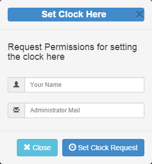 Al presionar el botón azúl de pedido de uso de reloj (Request clock use), se abrirá éste otro mensaje pidiendo ingresar el nombre del empleado que esta realizando el pedido y además el mail del administrador (el empleado debe solicitar al empleador el mail con el que éste último creo la cuenta en emplotime). Ver imágen a continuación.