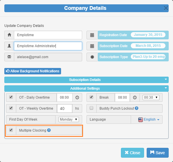 En el portal administrativo, presione el botón de detalles de empresa (Company Details), y seleccione «Multiple Clocking» desde el tabulador de setéo adicional (Additional Settings) .