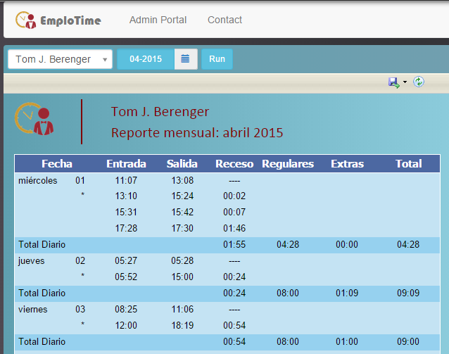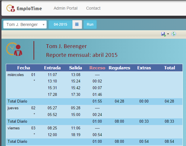 Luego, podrá imprimir reportes mensuales o reportes entre dos fechas, que le permitirán visualizar tanto ésta información como los totales de receso diarios y el calculo total de horas diarias trabajadas y por supuesto el total trabajado según el reporte pedido.