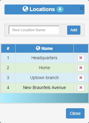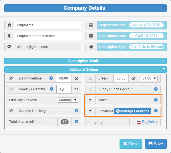 Locations: Al seleccionar ésta opción y agregar ubicaciónes por medio del botón de administración de ubicaciónes (Manage Locations), los empleados podrán escojer el lugar de trabajo o ubicación, inmediatemente al presionar el botón de Entrada (IN) desde el reloj de presentismo de Emplotime.